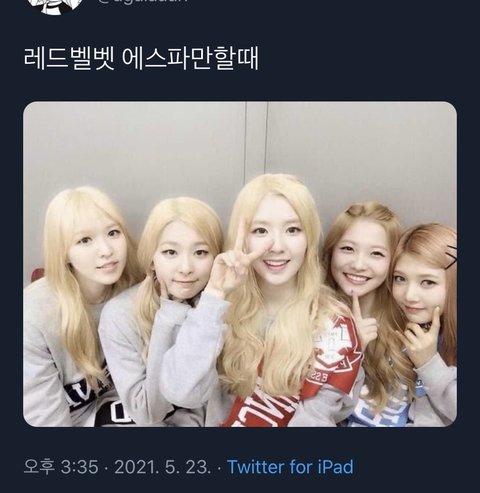 아 저때ㅋㅋㅋㅋㅋ 무슨 머리색가지고 뱀파이어 서열이다? 백금발에 가까울수록 높은거다 이러면서 아이린=웬디>슬기>그다음 조이 예리다 그러면서 세계관 궁예 오지게 했는데 팬싸가서 물어보니까 그냥 다 같이 탈색했는데 두피가 달라서 색 다르게 나온거라고...개웃겼음 러비들 뻘쭘,,╋) 조이는 주황으로 한번 더 덮었대 헷갈린 애들은 ㅆㄹ...