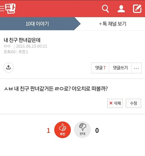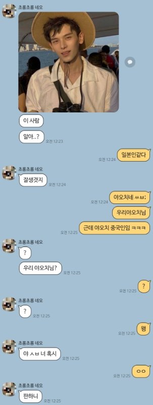 얘도람 나 어제 친구 판녀같다고 야오치로 떠볼까한 쓰닌데 저기 야오치 사진 보낸 사람 나 맞앜ㅋㅋㅋㅋㅋㅋㅋㅋㅋㅋㅋㅋㅌㅌㅌㅌ덕분에 나더 처음으로 판밍아웃했다..^^판녀감별사 우리 야오치님❤