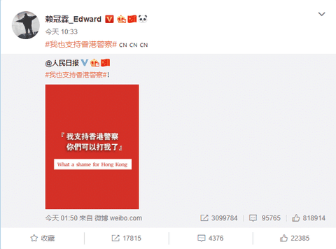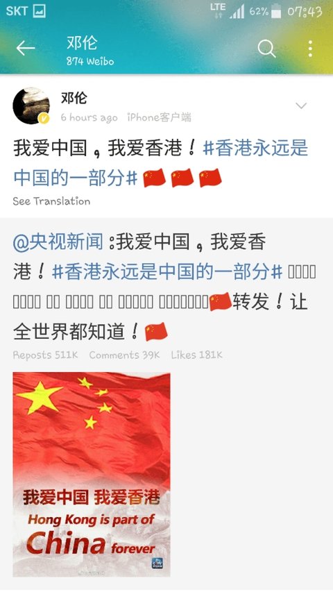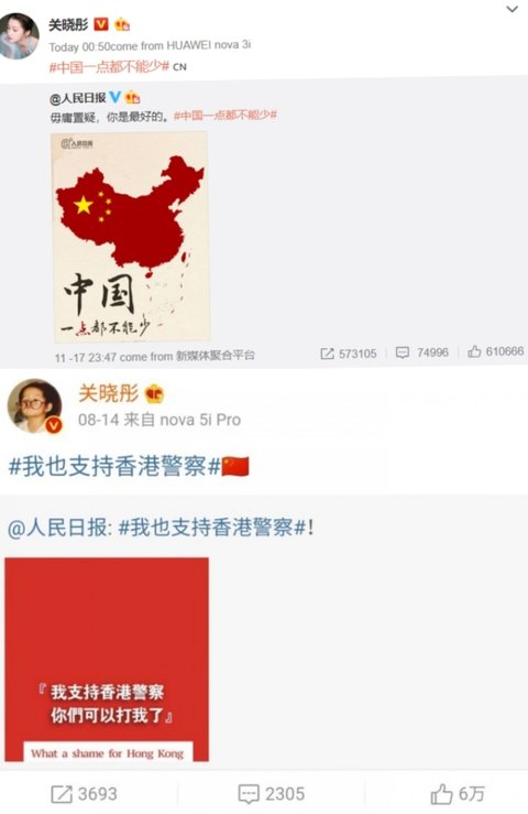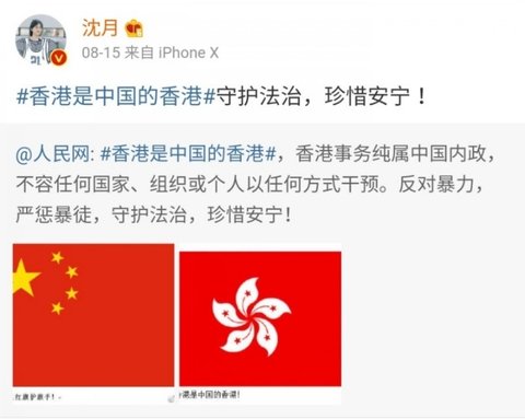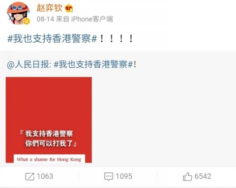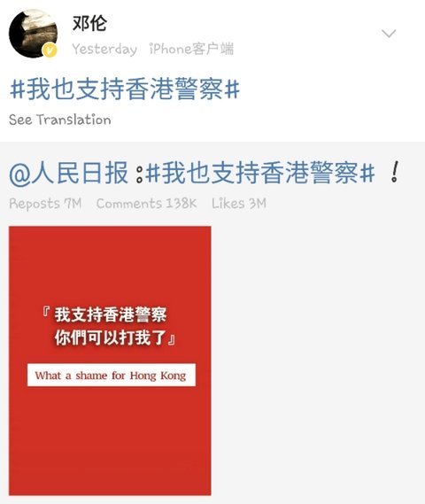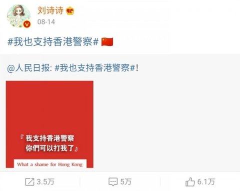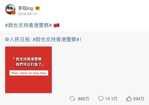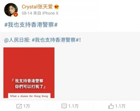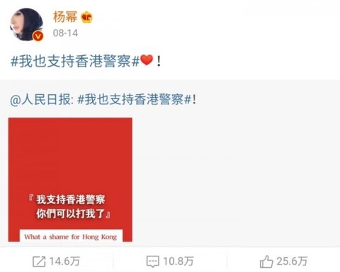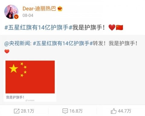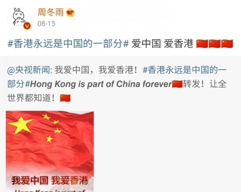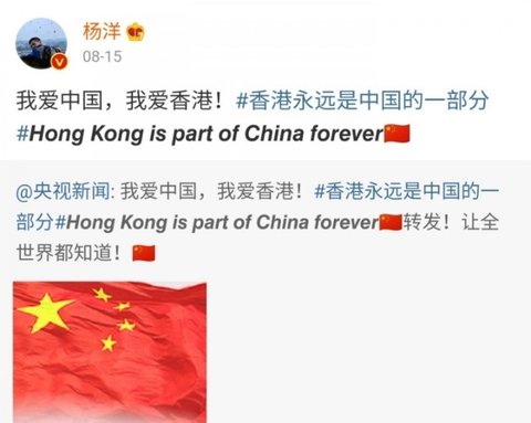 = 항미원조, 남중국해, 홍콩경찰 지지. 홍콩은 중국의 일부라고 올림, 항미원조 참전군인에게 케이하트날림.