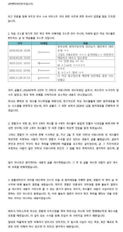 최근 언론을 통해 보도된 본사 소속 아티스트 리아 관련 사건에 관한 회사의 입장을 말씀 드리겠습니다.