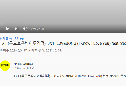 원래 투바투는 꾸준히 조회수 오르는 편임 작년에 낸 553도 최근에 1억 달성했음