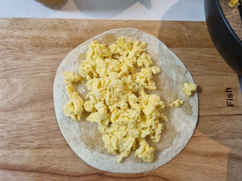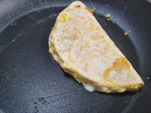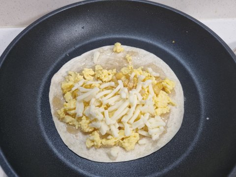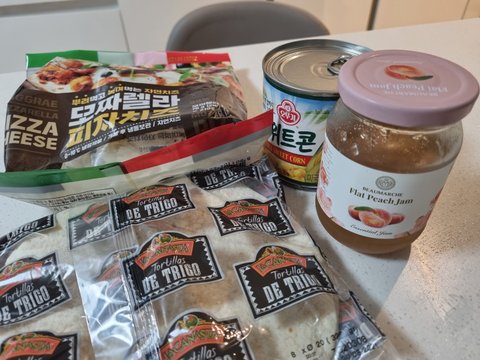 또띠아에 그냥 납작복숭아잼 바르고 스크램블 넣고 모자렐라 넣어서 구웠음...