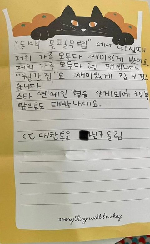 아이가 쓴 편지를 사진찍어서 SNS에 올린 김지석