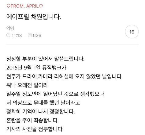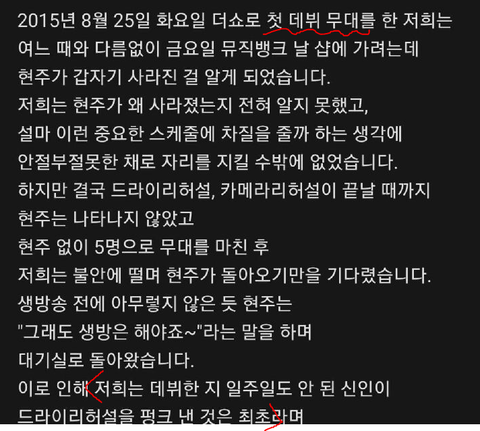 1차 입장문 '데뷔 무대'에서 현주 펑크내서 신인이 어쩌구