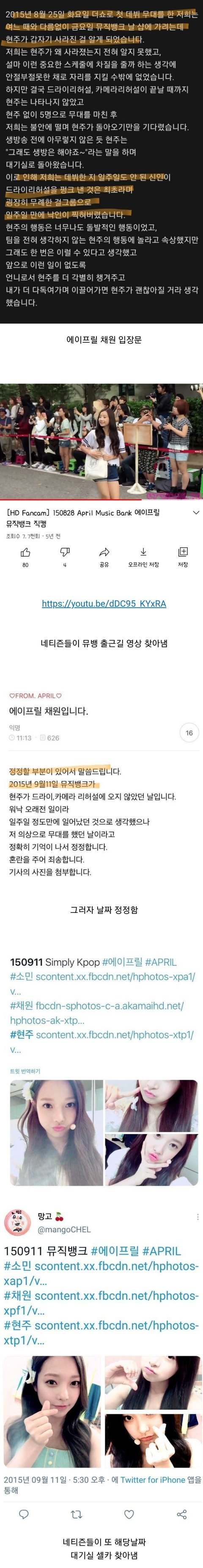 에이프릴 단체로 사패같음..대체 현주 몇번을 죽이는거임? 앞뒤가 하나도 안맞고 지들끼리도 말이 죄다 다른데 뭘 믿으라는거임...? 해명문 올라올수록 현주 진짜 지옥에서 살았다는것만 확신하게됨