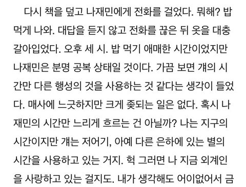 가끔 보면 걔의 시간만 다른 행성의 것을 사용하는 것 같다는 생각이 들었다.