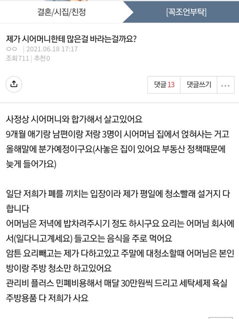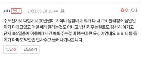 에휴..양심이 없으면 염치가 있으라고 몇번을 말하냐...밥얻어먹으면서 관리비 20나오는 집에 30주고 주방 욕실용품 세제 사고 청소했다고 큰~~~일하고 크게 보태준줄아네...환장하겠다.