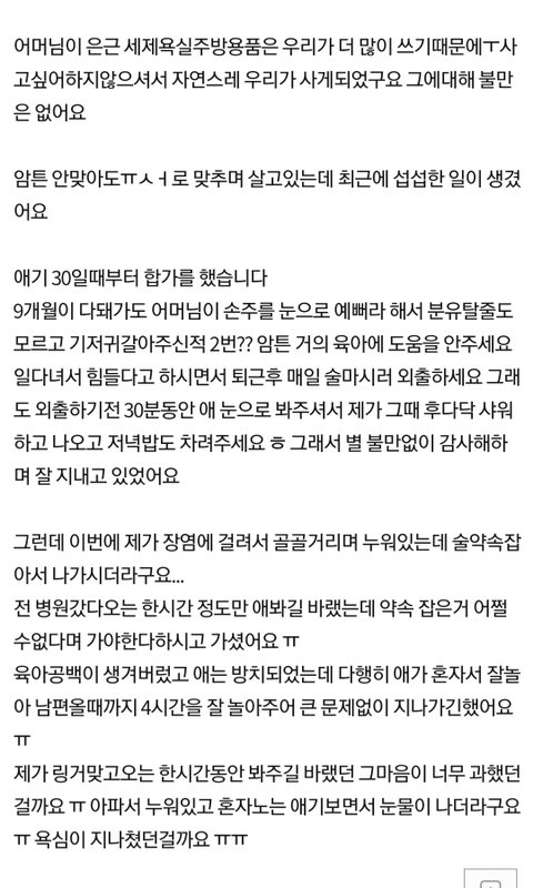 팩트는 시모는 갑자기 갓난쟁이 손주(2시간 간격으로 깨고 아직 낮밤 못가리는)와 아들 내외가 굴러들어와서 자기 집인데도 편히 쉬지 못하고. 관리비와 세제비로 푼돈 받으며 참으시는거네요? 하숙생 들여도 그것보단 많이 받을거 같은데? 시어머니는 무슨 잘못을 해서 돈도 안받고 황혼육아에 퇴근 후 집에서 편히 쉬지도 못해야 할까요? 글쓴분 아기가 어리고 몸이 고되고 다 이해는 가는데 시어머니도 평소에 쌓인거 참 많을거 같은데요? 물론 아프다는데 나가신건 정 없어 보이기는 하고 서럽기는 하나...(이 부분은 좀 차가워 보이시네요) 평소 어머님 입장서는 아들내외 따로 살면 내 생활 맘껏 즐기는데 결혼 시켜서도 신경 쓰이게 하니 피곤하다 느낄수 있을거 같아요. 어짜피 님네가 시어머니 노후를 책임져줄 것도 아닌데... 시어머니도 나름 인생 즐기시며 노후 준비해야 하는거 아닐까 싶기도 하구요.