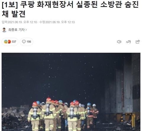 쿠팡 화재현상서 실종된 소방관 숨진 채 발견..
