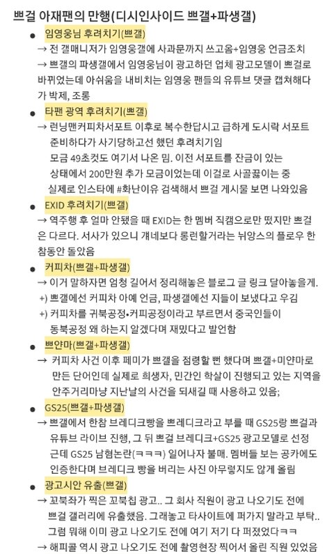 아이돌에 페미 묻으면 생기는 일. 쁘걸 초반부터 군인이 아니라 여덕들 덕분에 뜬거라고 군인들 비하하고 조롱하다가 자기들 뜻대로 안되니까 또 또 남팬들 후려치고 있네 ㅋㅋㅋ