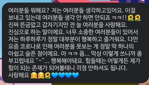 아이돌들은 버블 진짜 왜 안하냐? 진짜 존잼인데 나헌테 버블 시키면 하루죙일해서 팬들이 작작보내라고 뭐라할듯;; 참고로 나 망상충임 정신병 있다고 뭐라하지는 말아줘..