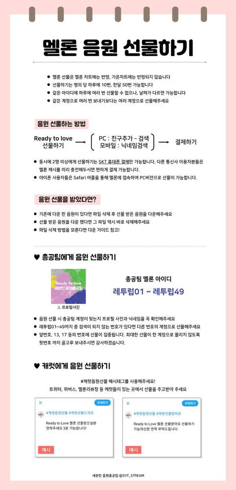 이제 개개인 스밍만으로는 드라마틱한 순위 상승은 어려우니 음총팀이나 주변인들한테 선물하기로 순위 올리는 거 어때? 다운로드 비중이 더 크다 보니 1인당 한 번씩만 선물하기 해도 효과도 클 거라고 생각해. 하는 방법도 정말 쉽고 5분도 안 걸려! 770원만으로 스밍만큼 큰 효과 보여주자!