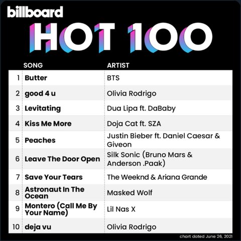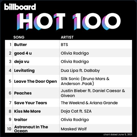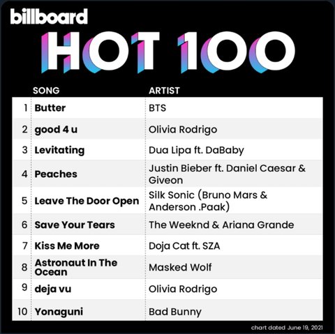 이게 얼마나 위대하고 놀라운 기록이냐면 발매첫주 빌보드 핫100 1위한 곡이 54개뿐이 없는데 그중에 방탄노래가 4개임