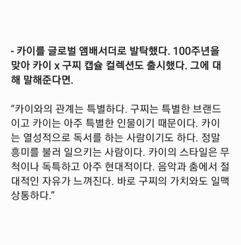 이번에 구찌 100주년 기념 인터뷰에서 3년연속 구찌 글로벌 앰버서더로 발탁된 카이에 대해 언급해서 가져와봄