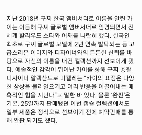 구찌에서 카이를 대하는게 각별하다는 것은 알고 있었지만 이렇게 구찌 CEO회장과 총괄 디자이너가 카이를 많이 아끼는게 새삼 실감나서 한국인으로서 너무 자랑스럽다 ㅎㅎ