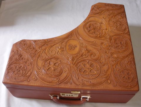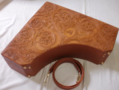 가죽에 바로크 디자인을 카빙하고 천연 염색하였으며,곡선을 살린 디자인과 내부 구조는 이중 구조로 팬플룻 수납과 충분한 수납공간 등 실용적이고 럭셔리하게 제작한 핸드메이드 천연가죽 팬플룻 케이스(악기가방)입니다.(마디샤 가죽공예-