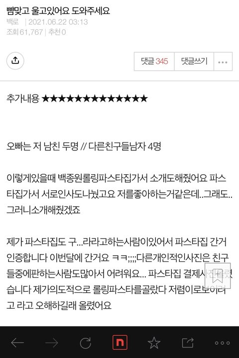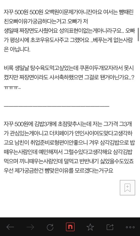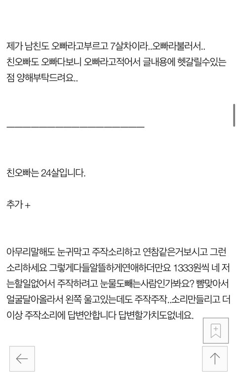 백미미는 주작 안한다고요! 우리오빠 좋은 시람이라고요! 28살은 30살 아니라서 어린데용?ㅇㅅㅇ? 초코우유랑 길가 꽃이랑 김밥만으로 행복하거든용? 기념일에는 비싼 탕슉이랑 롤링파스타 갈꺼거든용?빽!! 오빠는 취준생이지만 미미는 행복해용 ㅠㅠ!