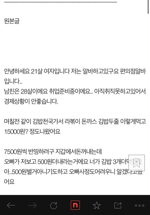 남친은 평상시에는 삼각김밥먹으며 돈아끼며 끼니때우면서..겨우버티는거라 저도 남친의사정을 알기에 삼각김밥먹으며 공부하는사람인데 500원이라도 그사람에겐 10대때 중고등학생들한테 500원소중한거처럼 그런가보다했어요. 사랑에 돈이 중요한가요? 제가 50이나 버니까 가끔 기념일에는 한스델리가서 밥 사는데 그때마다 남친이 고맙다고 울어요