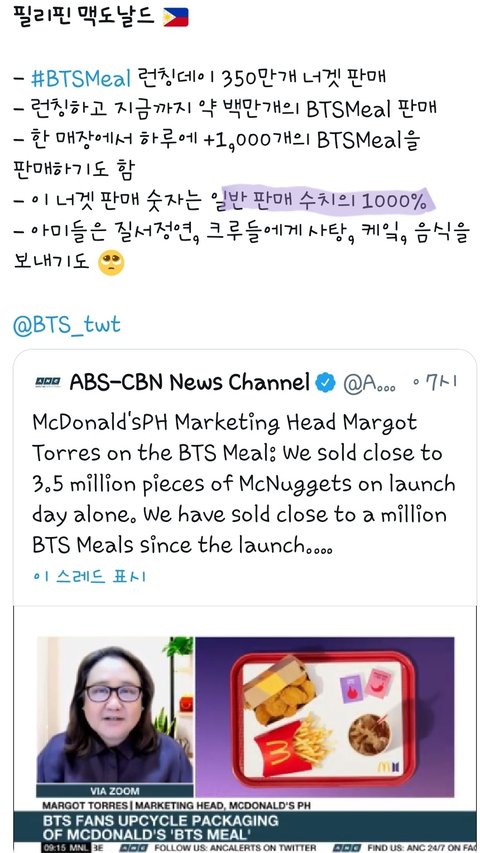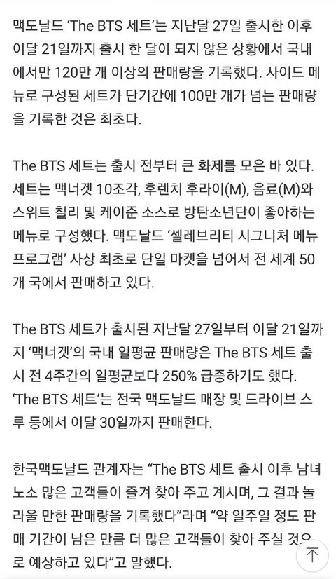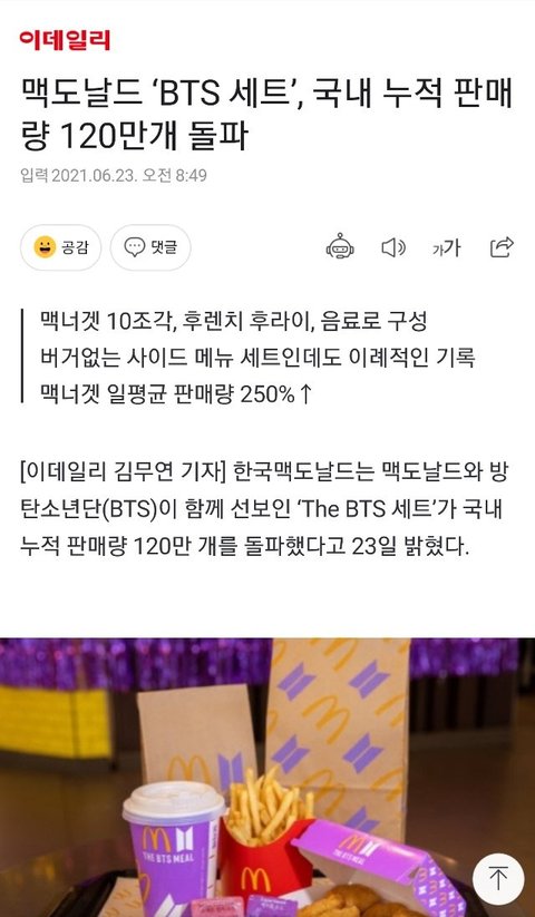 맥도날드 ‘BTS 세트’, 국내 누적 판매량 120만개 돌파