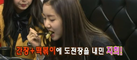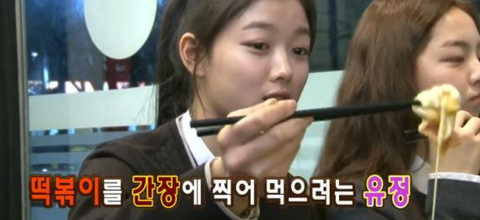 떡볶이를 간장에 찍어 먹는 유정이