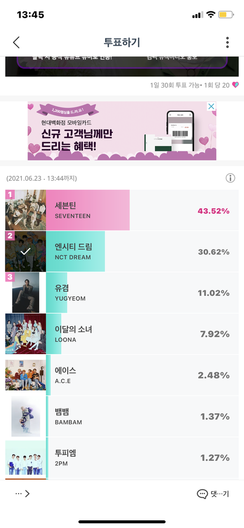 하트 20개가 한 표인데 25초마다 광고 볼 수 있음