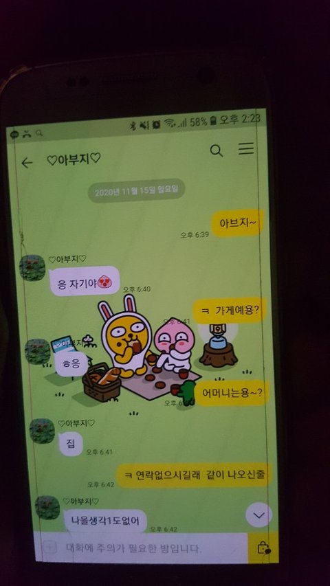 안녕하세요~아직도 정신 못차리고있는 쓰니입니다제가 글을 올리고 힘들어서 볼엄두가 없어서 지금에서야 보게되네요우선 저희 어머니가 재혼한 새아버지입니다~저도 결혼하고 평범한 가장이라고 생각했고 저에게 이런일이 생길꺼라 한번두 생각해보지 못했습니다 그냥 남들처럼 일 하고 집에와서 집사람 애기보는 낙으로 살았구요40대중반이되서두 제가 단호하게 못하는점은 제 소원이 애들한테 클때까지 아버지로써옆에서 버팀목되어주자입니다 제가 어릴때는 아버지라는 부재가 너무 크게다가와서제 아이들 만큼은 꼭 그러구 싶어서 바보같이 미련하게 버티구있었습니다제 친동생과저는 증거를 더모을려고했지만 저희 어머니가 터트려버려서 이젠 증거잡기가 쉽지않아서 자포자기로 글써본겁니다제가 조그만하게 장사를하는거라 아침에나가서 밤12시쯤에 집에들어옵니다 그중 출퇴근시간만 왕복 4시간정도되구요가게 가까운곳으로 이사하구싶지만 친정식구랑 처제가족등이 전부 성남에 살구있어서 쉽게 이사못간거구요저희 어머니는 포천에살구있구 차량으로 거리가 1시간정도입니다 1달에 한번쉴까말까해서 제가 포천으로는 큰명절빼구는 잘못가는 형편이였습니다제가 부탁안해두 집사람이 애들데리고 포천까지 잘왔다갔다했구요~그래서 참 고마워햇습니다 진심으로ㅜㅜ집안 망신이고 너무 화가나고 말할때가 없어서 찌질하지만 여기라도 말해야 속이시원해질거같아서요 주작 아닙니다20대부터 장사하다 30대후반에 한번 휘청하구나서는 챙피해서 친구 동료 아무도 안만나구싶더군요 아기까지생기다보니 더욱더 움츠러들고 돈은 전부 제가 벌어야 살수있는환경입니다처가쪽 어느 누구도 도움 없습니다~ 이런일 생기구나니 주위에 아무도 없더군요 처제한테 도움을 요청했지만 신경과민이다 오바한거다라구말만하구 좀지나구나니 처가쪽은 전부 연락 안하드라구요~그사이 새아지라는 작자는 장인어른한테 저나해서 제가 오버하구 오해한거라구하더군요 나중에 장인어른한테 전화와서오버하지말구 괜히의심하고그러지말라구하시더군요ㅠㅠ참~카톡내용두 별루 많이 안남아있고 거의 페이스톡이더군요 더한 카톡은 애기들이름과 사진이 많이 섞여서 못올렸습니다~하루에 페톡 20~30통정도구 적은날은 시간이 길더군요~ㅎ이젠 슬슬 알려주신데로 유전검사하고 준비해야겠습니다(저 술못먹습니다,담배 3분에1갑정도피웁니다,출퇴근이 길다보니 살림 못도와줍니다 씻구 자기바뻐서요,한달에 2~3번쉽니다 ,장사망하구 저에대해 투자나 꾸민게없네요)코로나때문에 다들힘드실텐데 힘내라고 정신차리라고 응원해주신 분들 제가 정신이상자가 아니라고 해주시분들 감사하고 고맙습니다