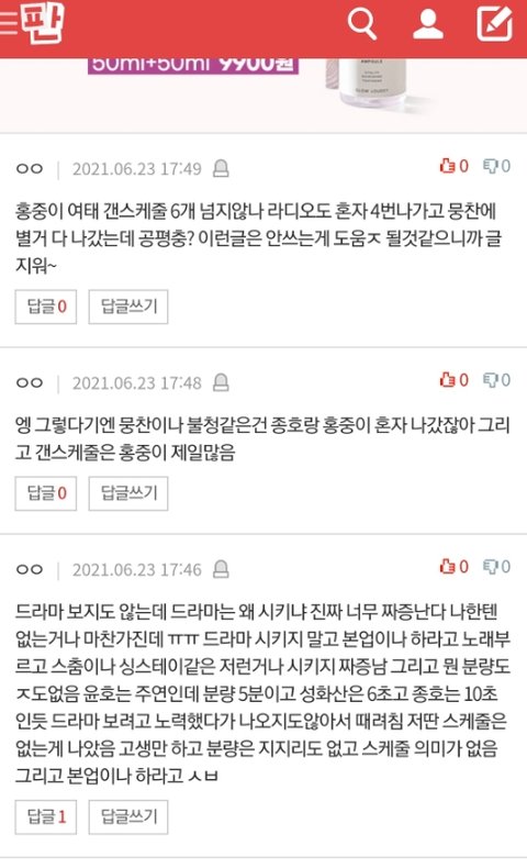 이번에 소외되는 멤 없어서 좋다는 글인데 핀트 잘못 잡음 저번에 드라마, Dj, 엠씨 언급하면서 여자연예인들이랑 같이 있는 거 짜증난다고 글 싸지르고 갔던애랑 같은 애인듯