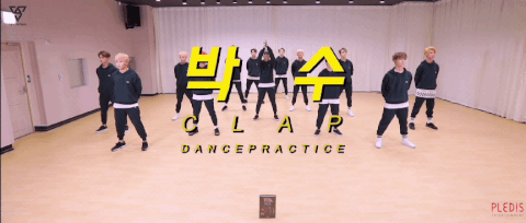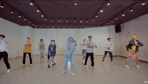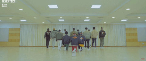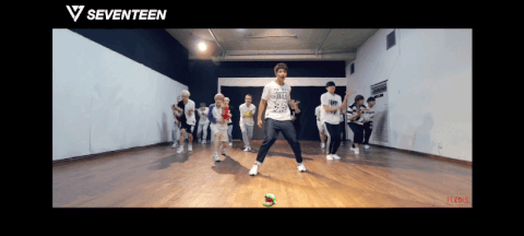 제일 왼쪽에 있는 빨간 나시티 입은 멤버(버논)는 팔 동작을 하지도 못할 정도로 13명이 들어가면 꽉 찼던 연습실부터 (데뷔곡 아낀다)