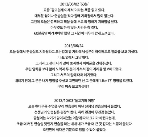 세븐틴 멤버 버논이 데뷔 전 적은 일기인데 이제 고래급으로 커진거야 세븐틴..ㅜㅜ 갑자기 이 일기가 생각나서 적어본 글임.. 끝~~~ 근데 움짤 움직이겠쥐? 글을 많이 안써봐서