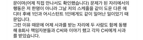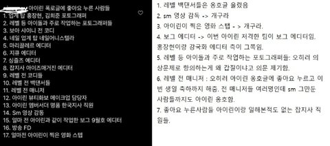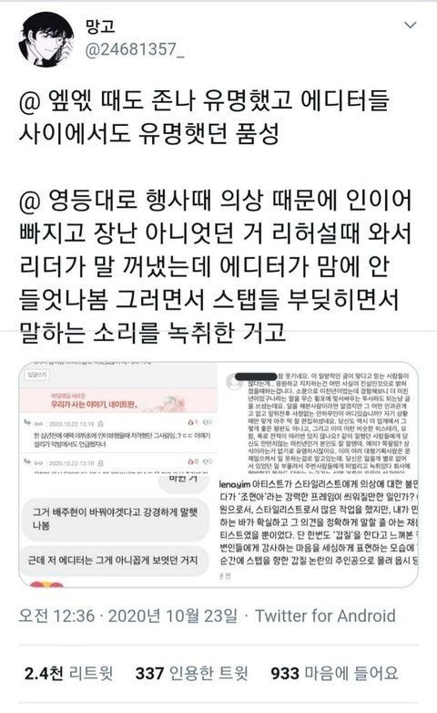 아이린이 갑질한건 에디터 뿐만 아니라 에디터 포함 3명임당일 아이린 사과 x 매니저가 직접 사과함팬들은 돈받고 합의 했다, 아이린 괴롭히지 말라고 에디터가 말했다, 전부터 문제 있었고 에프엑스 저격한 에디터다 인이어 문제 때문에 아이린이 스탭들한테 말한거고 에디터는 그걸 녹음한거다 왜곡하고 다님