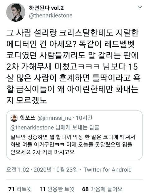 근거없는 판 댓글 가져다가 저 사람이 설리 크리스탈도 저격했다고 그때부터 이상했다고 여돌 저격 자주한단 식으로 몰아가고 이상한 사람 만듬. 하지만 정작 10년전 글 찾아보면 그 글 올렸던 사람은 전혀 다른 사람