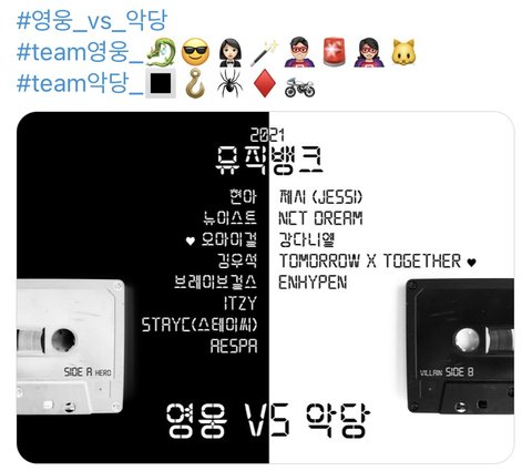 컨셉 영웅vs악당이라는데 투바투랑 오마이걸 옆에 하트 붙여놓은거 귀엽넼ㅋㅋ