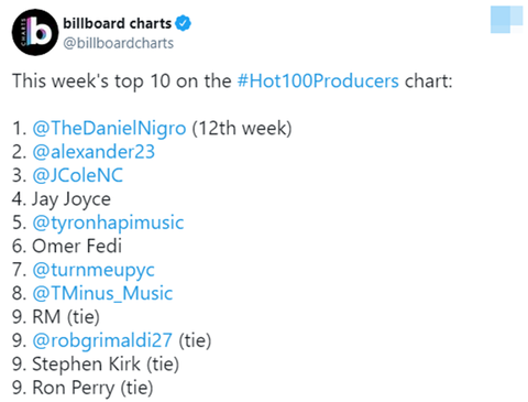 지난해 빌보드 송라이터 차트에 3위 프로듀서