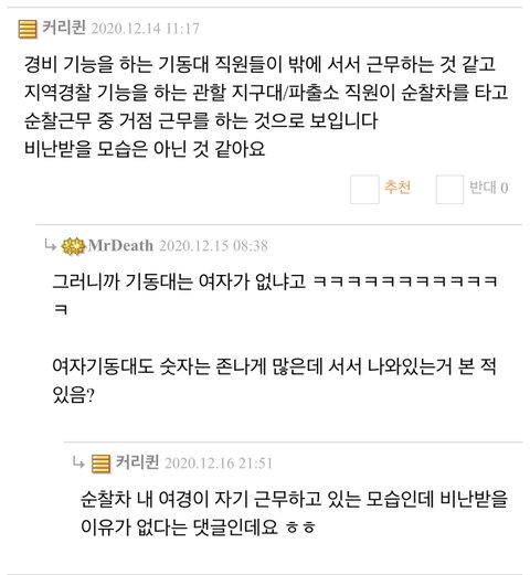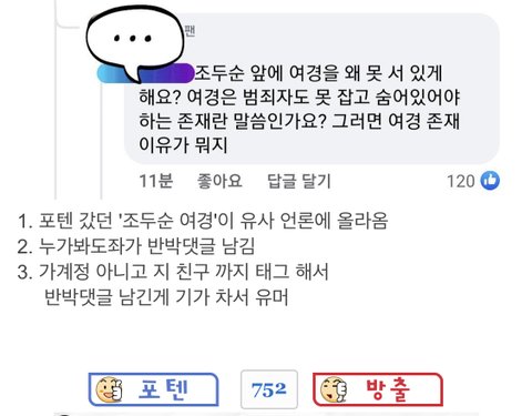 이렇게 자기들끼리 여경이라 편한 일을 했을 거라고 뇌내망상을 하고 페이스북에 올라온 일반인 여성의 추측댓글을 가져와서 그걸로 또 기정사실화해서 여혐하고...