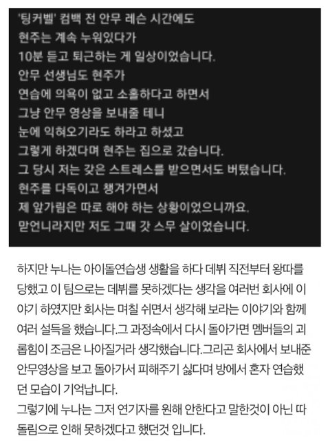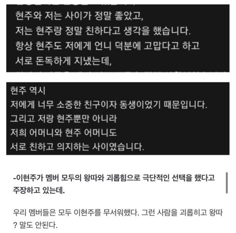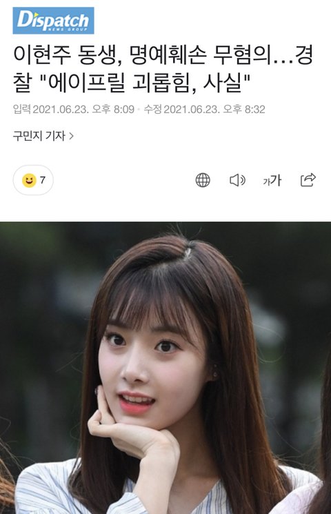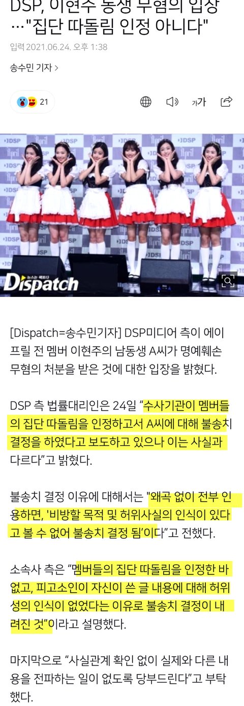 우리 에이프릴 멤버들은 이현주 집단 따돌림 인정 한 적 없는데~ 이현주 남동생이 쓴 글의 내용들이 허위사실로 볼 수 없어서 불송치 결정이 된 거야ㅇㅇ 오해하지마 우리 애들은 인정 안 했어!!! 그냥 무혐의만 뜬 거야!