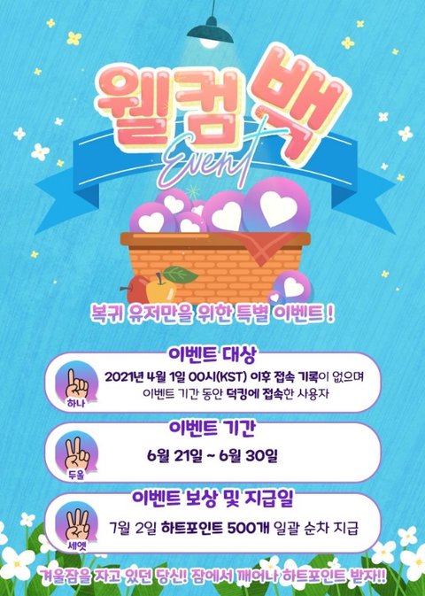 +) 예선은 짹에서 하는거고 우리 한창 성재랑 멤버들 ㄷㅋ하고 안했잖아 그런 사람들 하트포인트 500개 준댕 기간 놓치지 말고 받아놓자!(아래 사진)