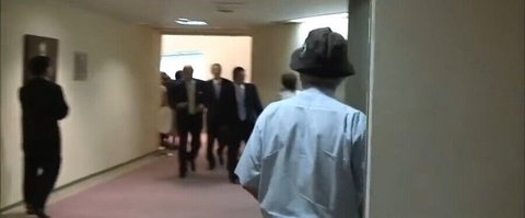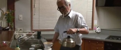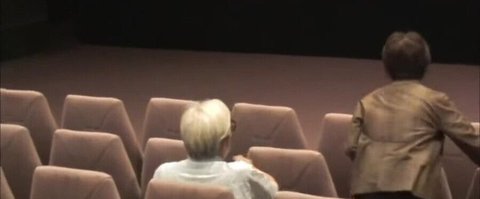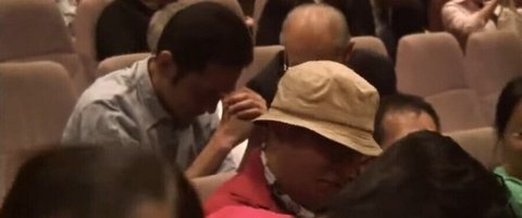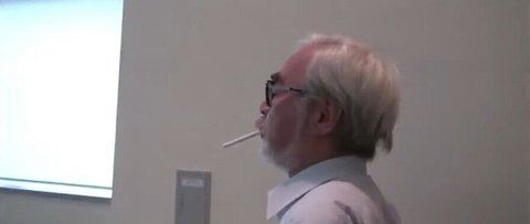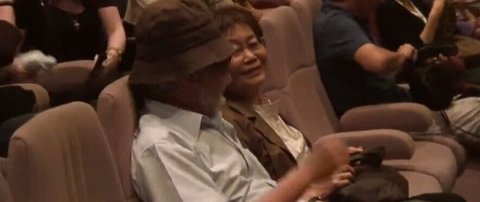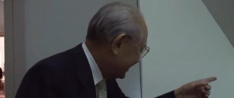 알 수 없는 표정으로 앉아있는 하야오 감독