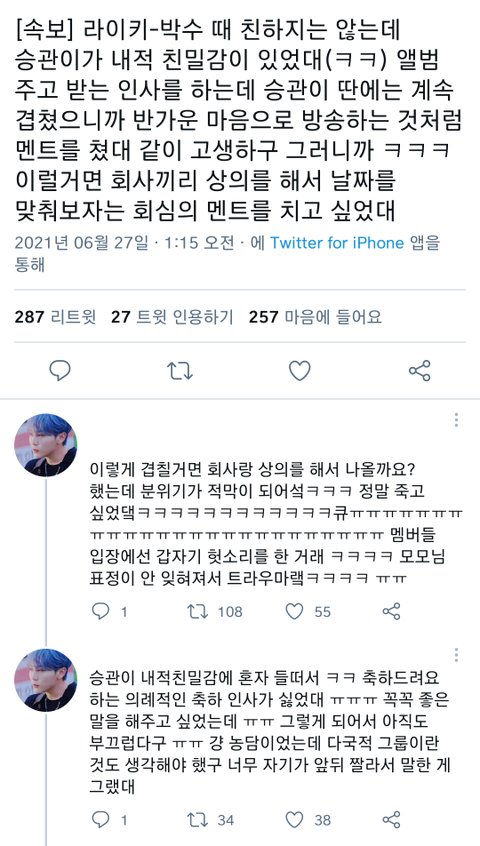 아앀ㅋㅋㅋㅋㅋㅋ친하지는 않지만 세븐틴이랑 활동이 너무 많이 겹쳐서 자기딴에는 내적친밀감에 저렇게 말했다가 이 흑역사 생성했다잖앜ㅋㅋㅋㅋ