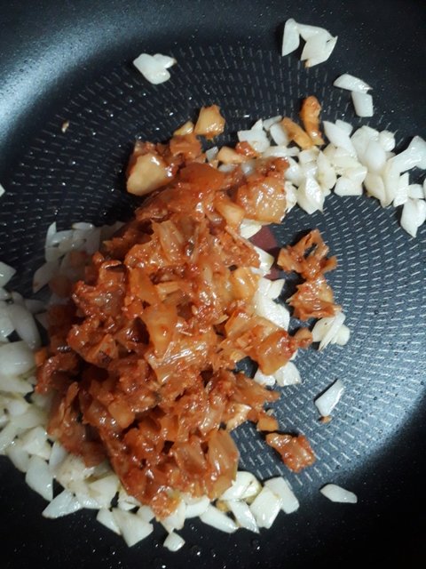 양파가 어느 정도 볶아졌으면 식용유를 약간 추가한 후 아까 썰어두었던 김치를 넣어준다