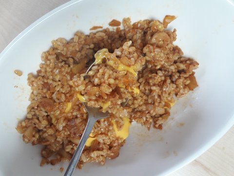 재료를 다 볶았으면 아까 김치를 썰어두었던 그룻에 밥 한공기 떠서 투하