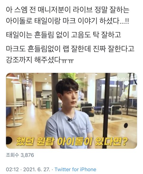 밑 댓 보고 영상 찾아서 캡 해왔어~남돌 중에 실물탑 하니까 우리 애들 언급하심 ㅠㅠ