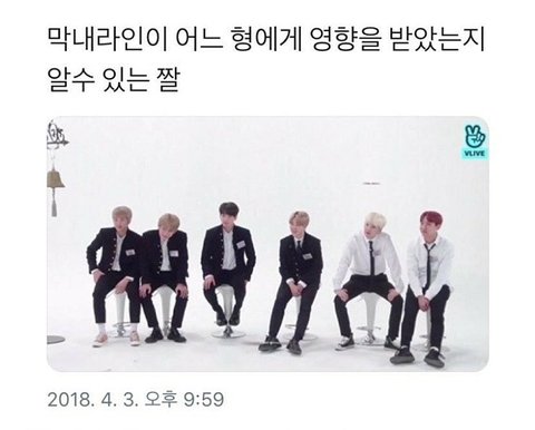 근데 잘어울림,, 정국이는 남준이 멋있어서 빅히트 들어왔고, 항상 밝은것도 제이홉 영향이 지민한테 많이 간듯..뷔는 슈가 귀여워하는듯 하면서도 슈가랩이 세상에서 제일 좋다고 하는거보면 믾이 좋아하는거 같음