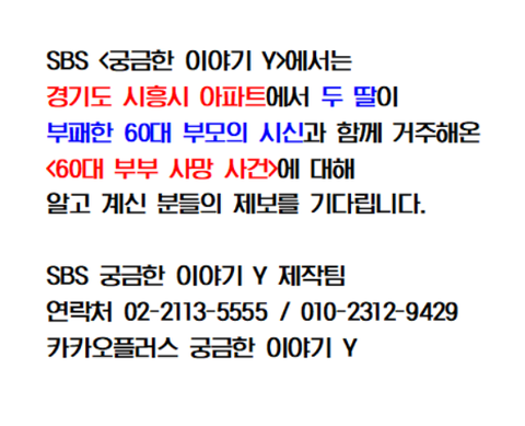 SBS <궁금한 이야기 Y> 에서는 경기도 시흥시 아파트에서 두 딸이 부패한 60대 부모의 시신과 함께 거주해온<60대 부부 사망 사건>에 대해 알고 계신 분들의 제보를 기다립니다