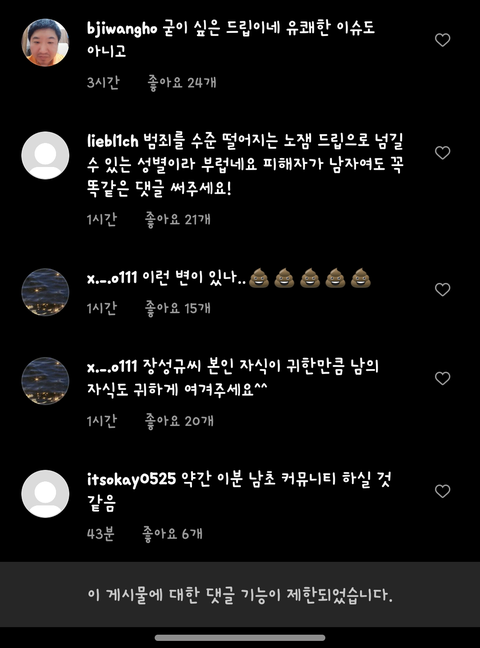 -> 피해자한테는 트라우마인데 경솔했다고 사람들이 대댓다니까 댓글 지우고 아무일 없던 것처럼 인스타에 아들 사진 올림 -> 사람들이 인스타에 비판 댓글 남기니까 아들 사진 올렸던 게시글 지우고 댓글 막아놓음