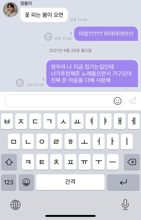 이번주만 버블 5번인가 오고 쉴틈없이 답장 계속 읽어주는 울 갱얼쥐 너무 사랑스럽고 고마워서 12시 되자마자 또 보냄 .. 정우가 좋은글만 봤으면 좋겠다 김정우 제일 사랑해 ..