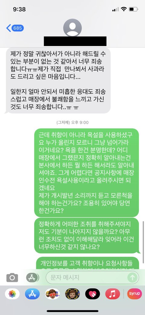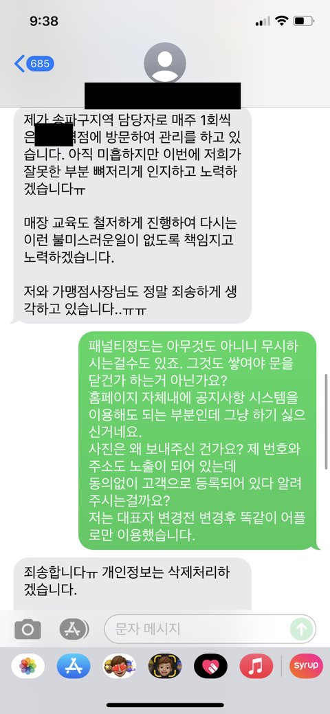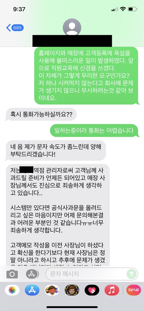저는 홈페이지와 지점에 이러저러한 욕설 사용으로 불미스러운 일이 생겼다. 사과문을 올리고 붙여줄걸 얘기했고