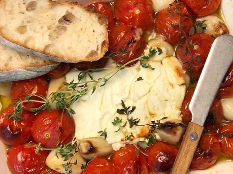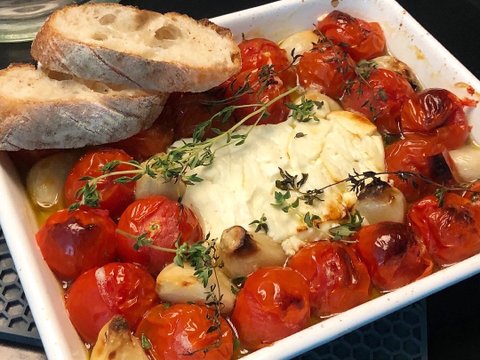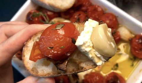 구운 토마토와 치즈를 바게트에 올려 먹기