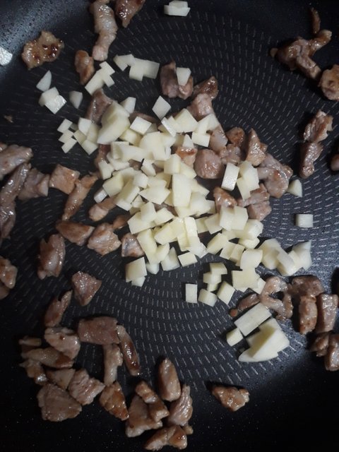 고기를 다 잘라서 볶았을 때 어느정도 익었다면 감자를 넣고 볶는다