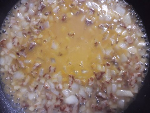 재료가 다 익으면 약불로 줄이고 아까 섞어두었던 걸 붓고 섞어줘