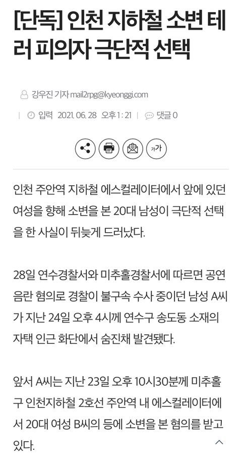 인천 소변테러남 자살했대ㅋㅋ